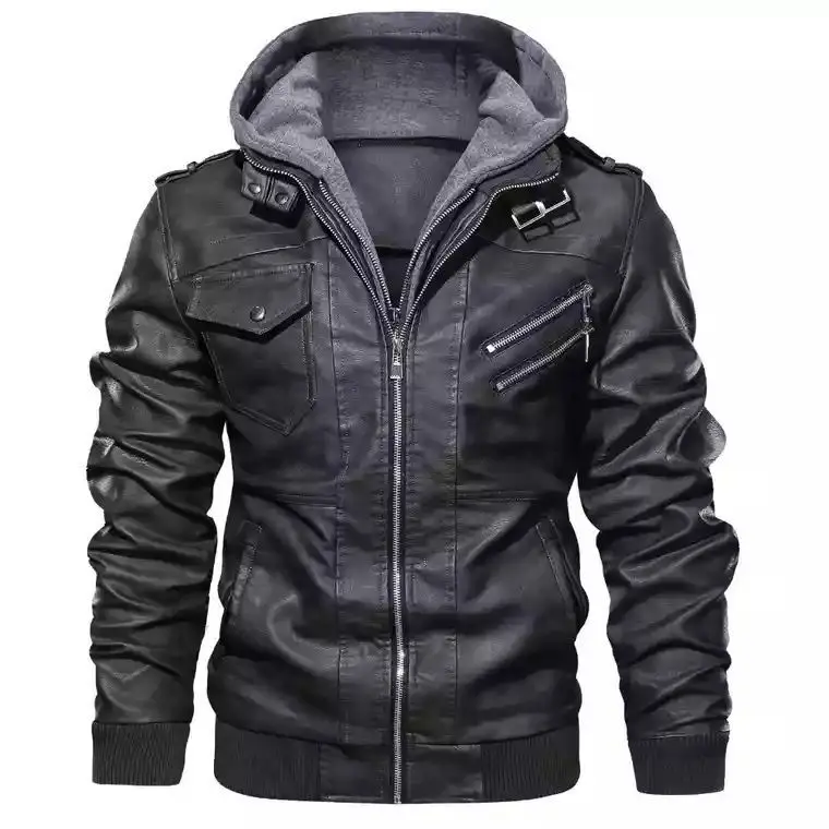 2025 PU Zipper Winter and Autumn Casual Hooded Zipper Young Black Stand-up Collar Men's Leather Jacket